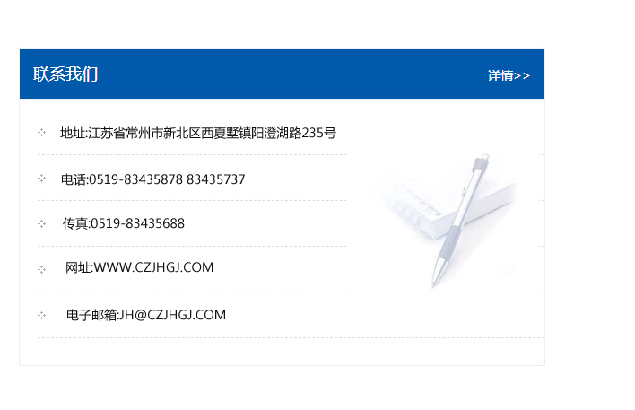 傳真:0519-83435688    郵編:213135    網址:WWW.czjhgj_com.tahwjs.com    電子郵箱:JH@czjhgj_com.tahwjs.com